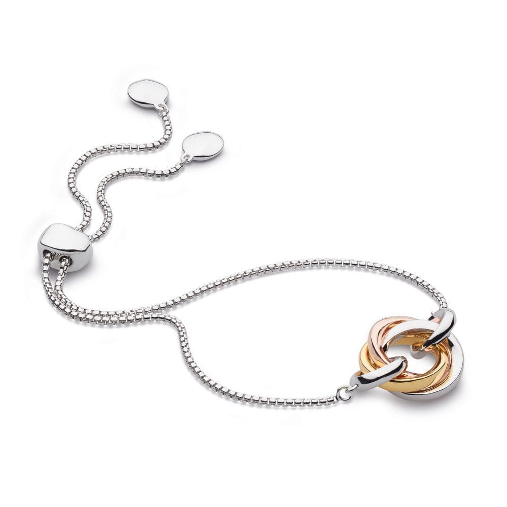 We have fallen head over heels with this latest addition to our Bevel family. Unyielding like the time it represents—with each ring symbolising its role within the trinity of the Past, Present, and Future—this contemporary interpretation of the Russian wedding ring is beautifully designed in rhodium-plated sterling silver, 18ct gold and rose gold plate. With its rounded box chain and smooth, sliding toggle clasp, the bracelet practically begs to be caressed with its tactile trio of bevelled rings.